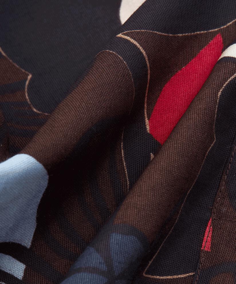 This top takes you straight back to the 70s with the brown tones and vibrant floral print. The top is made from a delicate, airy viscose fabric that feels great to wear. It is designed with a grandad collar, button placket with fabric-covered buttons and an A-shaped cut that emphasises the feminine look. Wear the top with bright red or blue trousers for a colourful look, or tone down the look with a simple black bottom.
